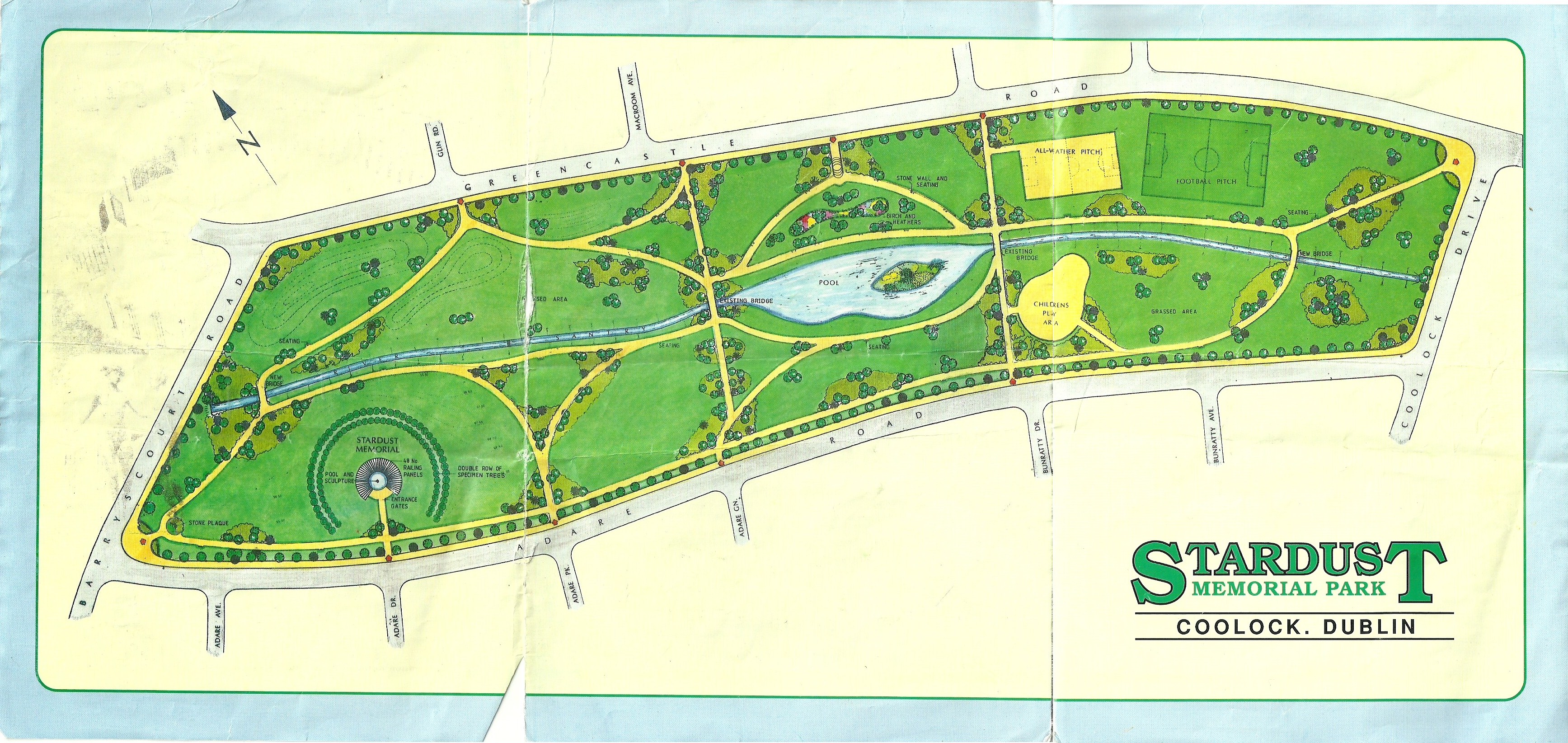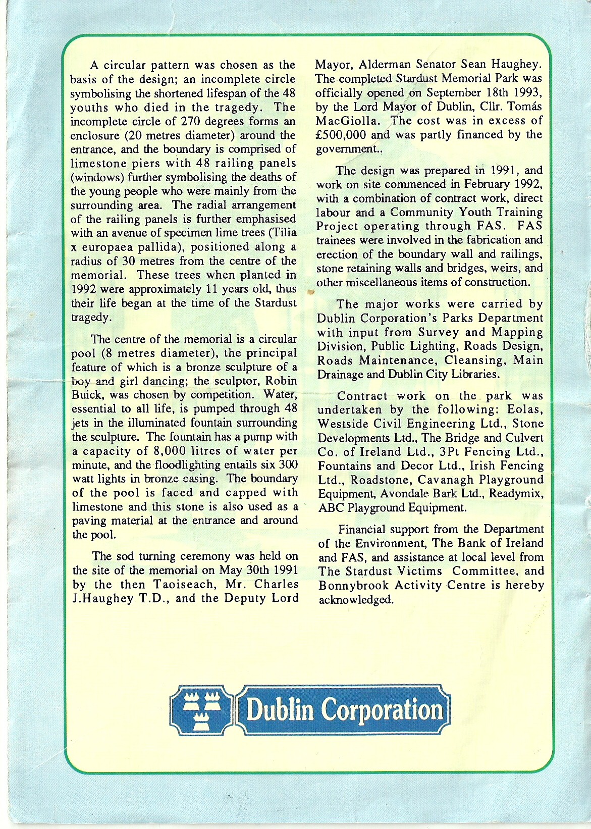 The Stardust Memorial Park was commissioned to commemorate the 48 people who lost their lives in the Stardust Nightclub fire of 14th February 1981. In 1991, on the 10th anniversary of the tragedy, the then Taoiseach, Charles Haughey and his son Seán Haughey, the then Deputy Lord Mayor, attended the sod turning ceremony. The park was officially opened on September 18th 1993 by the then Lord Mayor of Dublin, Cllr. Tomás MacGiolla.