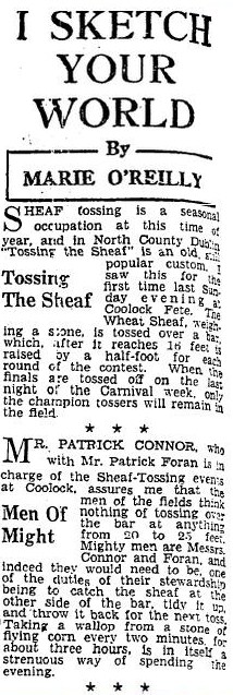 Sheaf tossing is a seasonal occupation at this time of year and in North County Dublin ‘Tossing the Sheaf’ is an old, still popular custom. I saw this for the first time last Sunday evening at Coolock Fête. The Wheat Sheaf, weighing over a stone, is tossed over a bar, which, after it reaches 16 feet is raised by a half-foot for each round of the contest. When the finals are tossed off on the last night of the Carnival week, only the champion tossers will remain in the field.